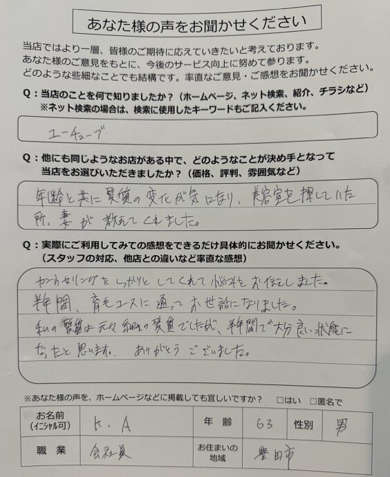 A:仕事の都合上、夜が遅くなってしまう中で、営業時間が長い為、自分の行ける時間に合わせてうかがうことができてよかったです。また、育毛としてのアドバイスが大変参考になって、髪の毛も増えたので良かったと思います。