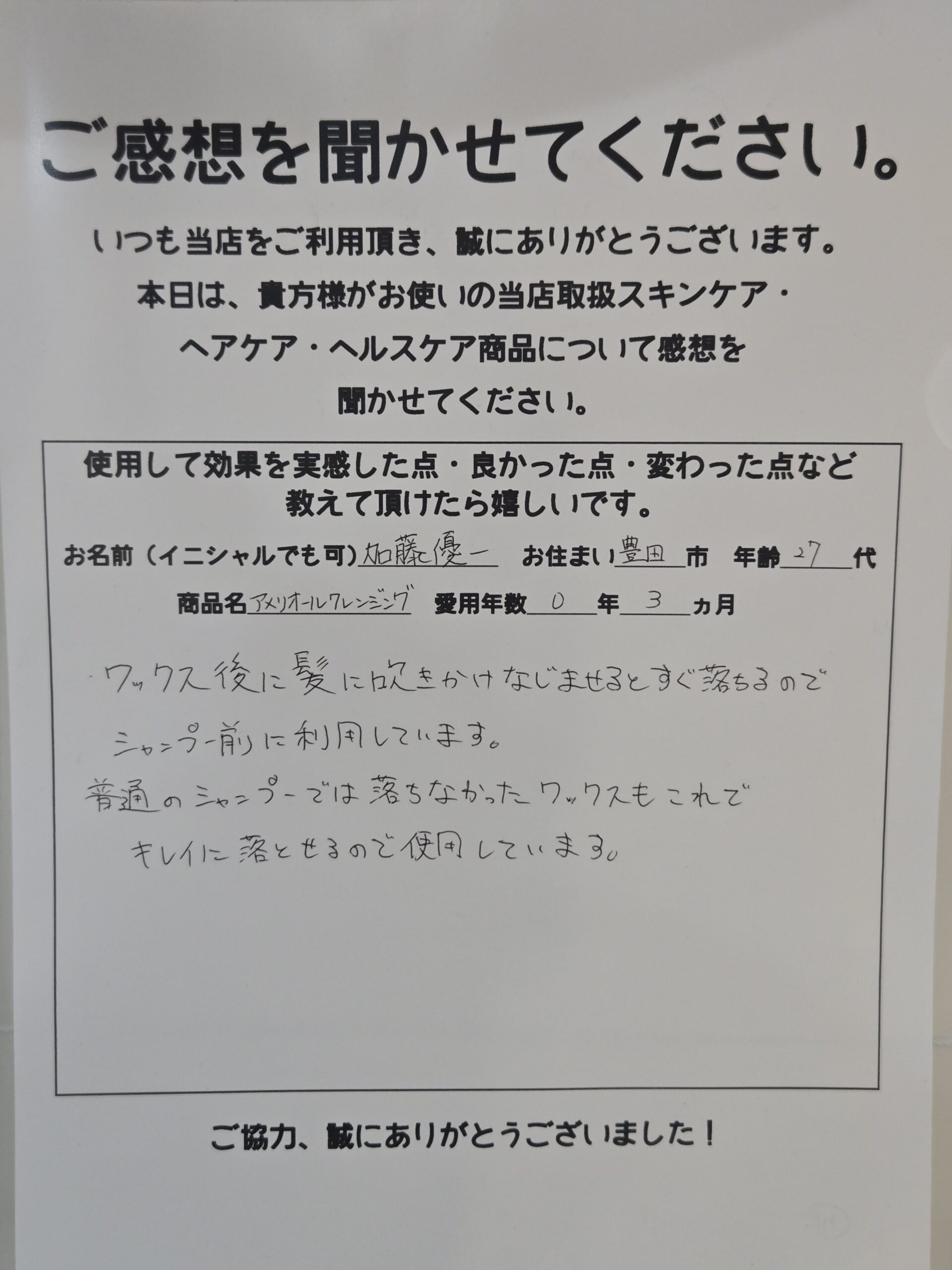 頭皮からキレイになった感じで、うす毛に悩んでいるため、そちらの方にもよい効果が出ることも期待しています。