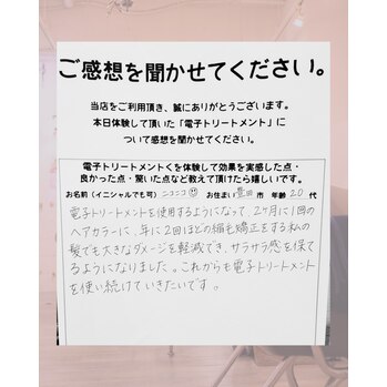 電子トリートメントを使用するようになって2ヶ月に1回のヘアカラーに年2回ほどの縮毛矯正をする私の髪でも大きなダメージを軽減できサラサラ感を保てるようになりました。これからも電子トリートメントを使い続けていきたいです。お名前:ニコニコ様年齢 :20代お住まい:豊田市