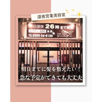明日急に予定が入った !どうしよう髪の毛がボサボサ白髪も染めたいのにまだ残業中。そんな時こそ深夜美容室がお役に立てます!シーヘアーは深夜26時まで営業しておりますのでお仕事帰りでも充分間に合います。遅い時間まで営業している美容室をお探しの方は是非シーヘアーをご利用ください。大切なシーンに美しくキレイな髪でお過ごしいただけますよ。