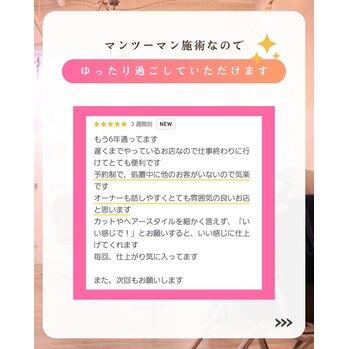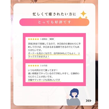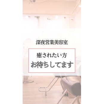 毎日忙しいあなたへ仕事帰りに美容室で癒されませんか?ゆったり過ごしていただけるように当店は完全予約制です。他のお客様と同時進行はございません。落ち着いたBGMが流れる店内でリラックスできる空間をお約束します。ぜび癒されに来てください。お待ちしております。